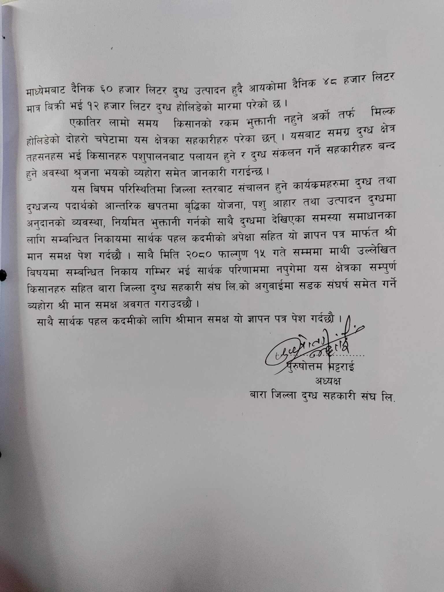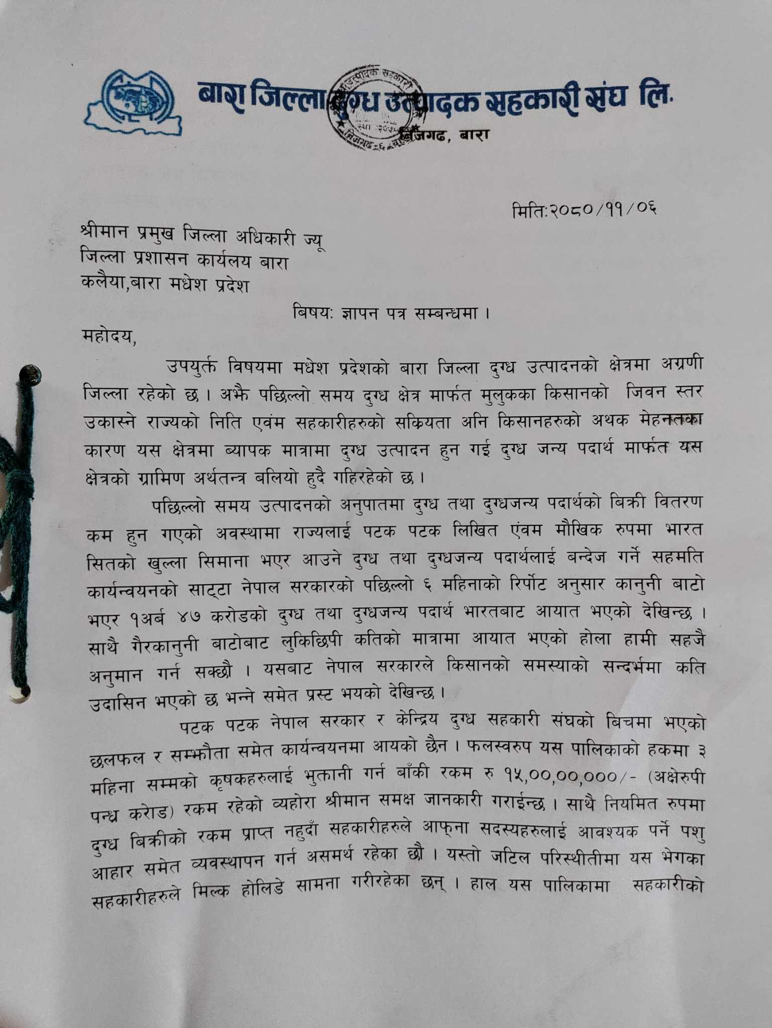 आईतवार बारा जिल्ला दुग्ध उत्पादक संघका अध्यक्ष पुरुषोत्तम भट्टराईले बाराका प्रमुख जिल्ला अधिकारी शशिधर घिमिरेलाई ज्ञापन पत्र बुझाएका हुन् ।