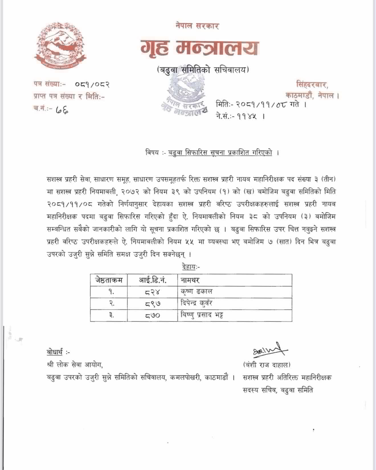 बिहीबार बसेको गृहसचिव नेतृत्वको बढुवा सिफारिस समितिको बैठकले कृष्ण ढकाल, दीपेन्द्र कुँवर र विष्णु भट्टको बढुवा सिफारिस गरेको हो। सिनियर रहेका कृष्णराज पाठक र मनीष थापा बढुवामा छुटेका छन्।