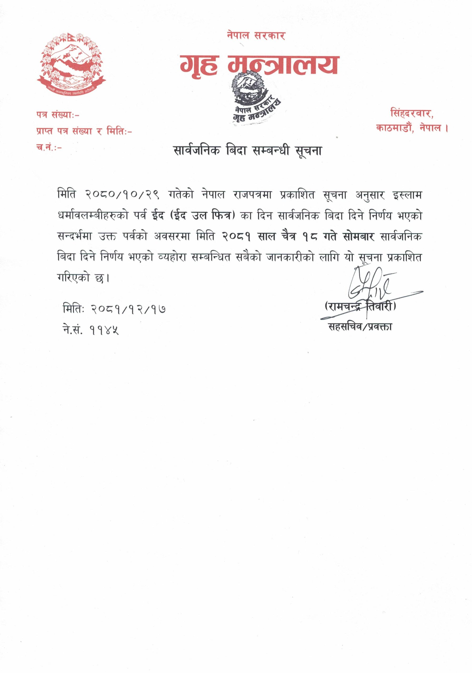 इदउलफित्रको अवसरमा भोलि सार्वजनिक बिदा दिने निर्णय भएको गृह मन्त्रालयका सचिव गोकर्णमणि दुवाडीले जानकारी दिए ।