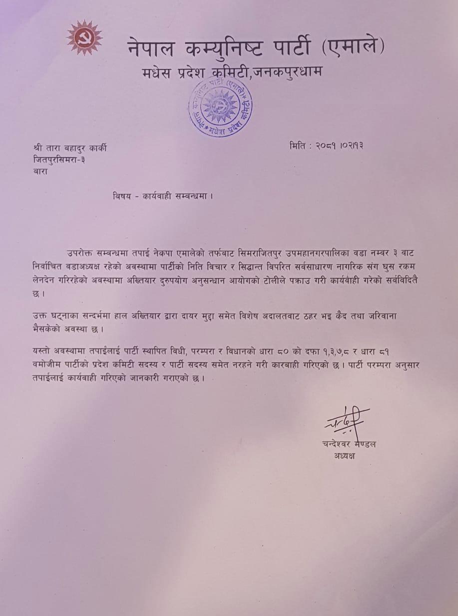 एमालेबाट सिमराजितपुर उपमहानगरपालिका वडा नम्बर ३ मा निर्वाचित वडाअध्यक्ष रहेको अवस्थामा पार्टीको निति विचार र सिद्धान्त विपरित सर्वसाधारण नागरिक संग घुस रकम लेनदेन गरिरहेको अवस्थामा अख्तियार दुरुपयोग अनुसन्धान आयोगको टोलीले पक्राउ प्रमाणीत समेत भएका कार्कीलाई एमाले पार्टीको स्थापित विधी, परम्परा र विधानको धारा ८० को दफा १,३,७,८ र धारा ८१ वमोजीम पार्टीको प्रदेश कमिटी सदस्य र पार्टी सदस्य समेत नरहने गरी कारबाही गरिएको थियो ।