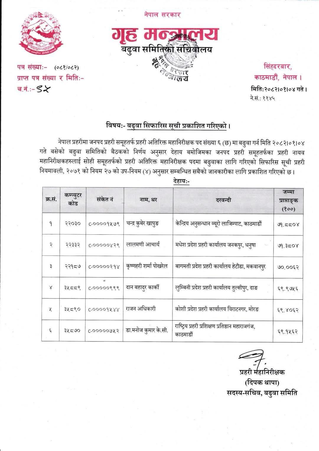 यो सिफारिसमा राष्ट्रिय अनुसन्धान विभागबाट नेपाल प्रहरीमा स्थानान्तरण भएको टोली छुटेको छ। सिफारिसमा २०५४ सालमा भर्ना भएको टोलीमा समेत वरियता मिचिएको छ।  यो टोलीका कार्कीलाई पहिलो वरियतामा बढुवा सिफारिसमा गरिएको छ। दोस्रो वरियतामा रहेका केसीलाई तेस्रो र तेस्रोमा रहेका अधिकारीलाई दोस्रो नम्बरमा सिफारिस गरिएको छ।