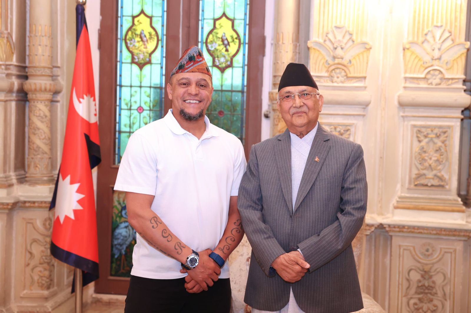 काठमाडौं । प्रधानमन्त्री केपी शर्मा ओली र ब्राजिलका चर्चित फुटबल खेलाडी रोबर्टाे कार्लाेसबीच आज भेटघाट भएको छ ।