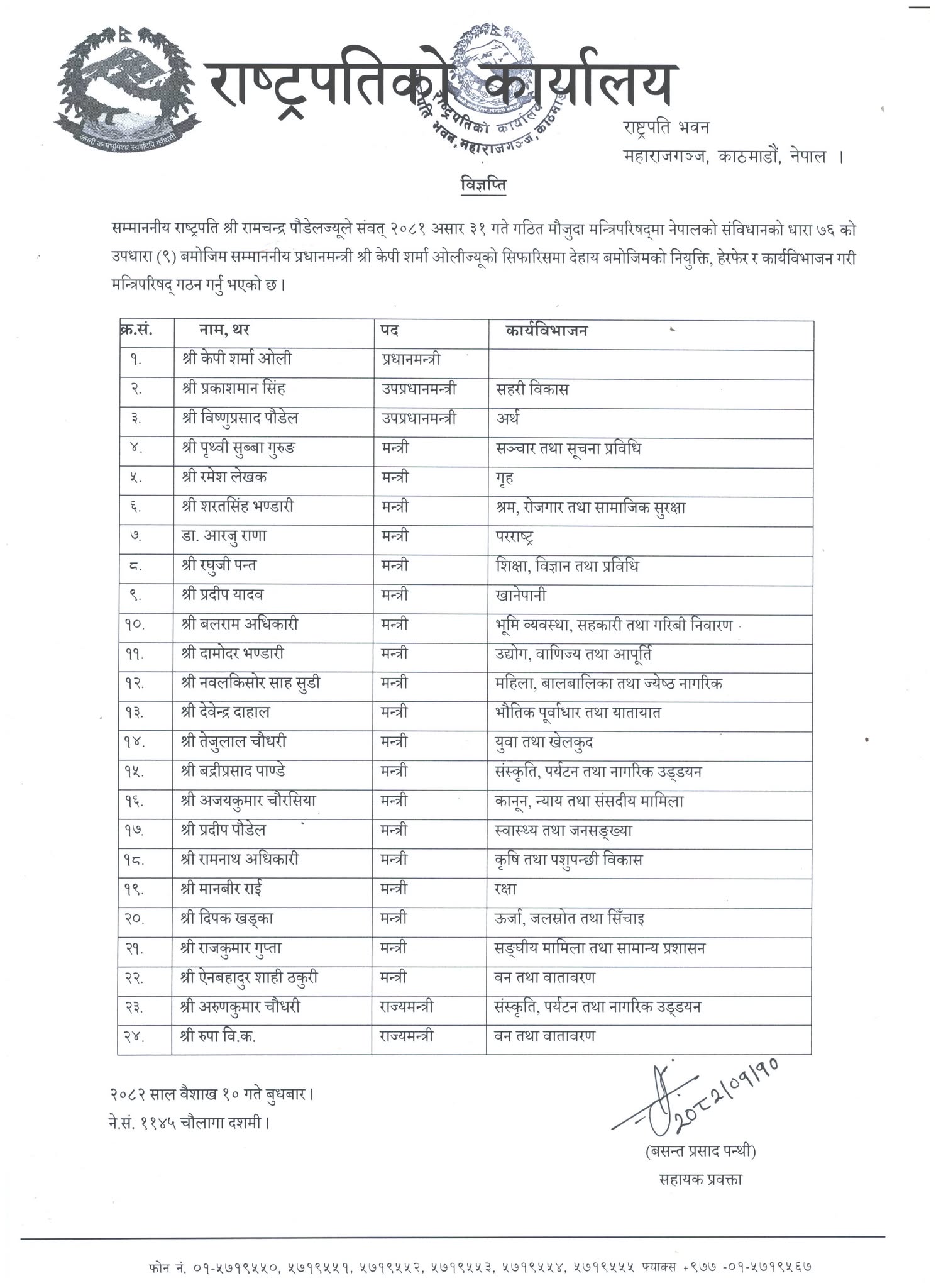 आजै प्रधानमन्त्री केपी शर्मा ओलीले ऊर्जाराज्यमन्त्री पूर्णबहादुर तामाङलाई हटाएका थिए । शीतल निवासको विज्ञप्ति नियुक्ति, हेरफेर र कार्यविभाजनसहितको मन्त्रिपरिषद् पूनर्गठनको सूची सार्वजनिक गरेको छ । ऊर्जाराज्यमन्त्रीको पद भने खाली छ ।