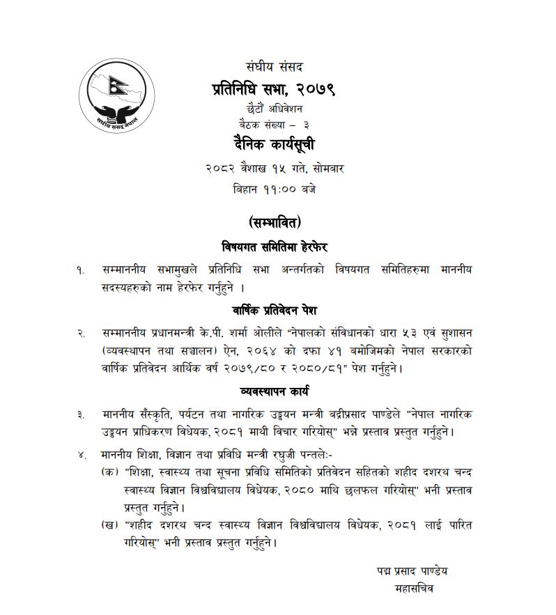 प्रधानमन्त्री केपी शर्मा ओलीले ‘नेपालको संविधानको धारा ५३ एवम सुशाषन (व्यवस्थापन र सञ्चालन) ऐन, २०६४ को दफा ४१ बमोजिमको नेपाल सरकारको वार्षिक प्रतिवेदन आर्थिक वर्ष २०७९/८०, २०८०/८१ पेस गर्नेछन्। उता, संस्कृति, पर्यटन तथा नागरिक उड्डयन मन्त्री बद्रीप्रसाद पाण्डेले ‘नेपाली नागरिक उड्डयन प्राधिकरण, २०८१ माथि विचार गरियोस्’ भन्ने प्रस्ताव प्रस्तुत गर्ने छन् ।