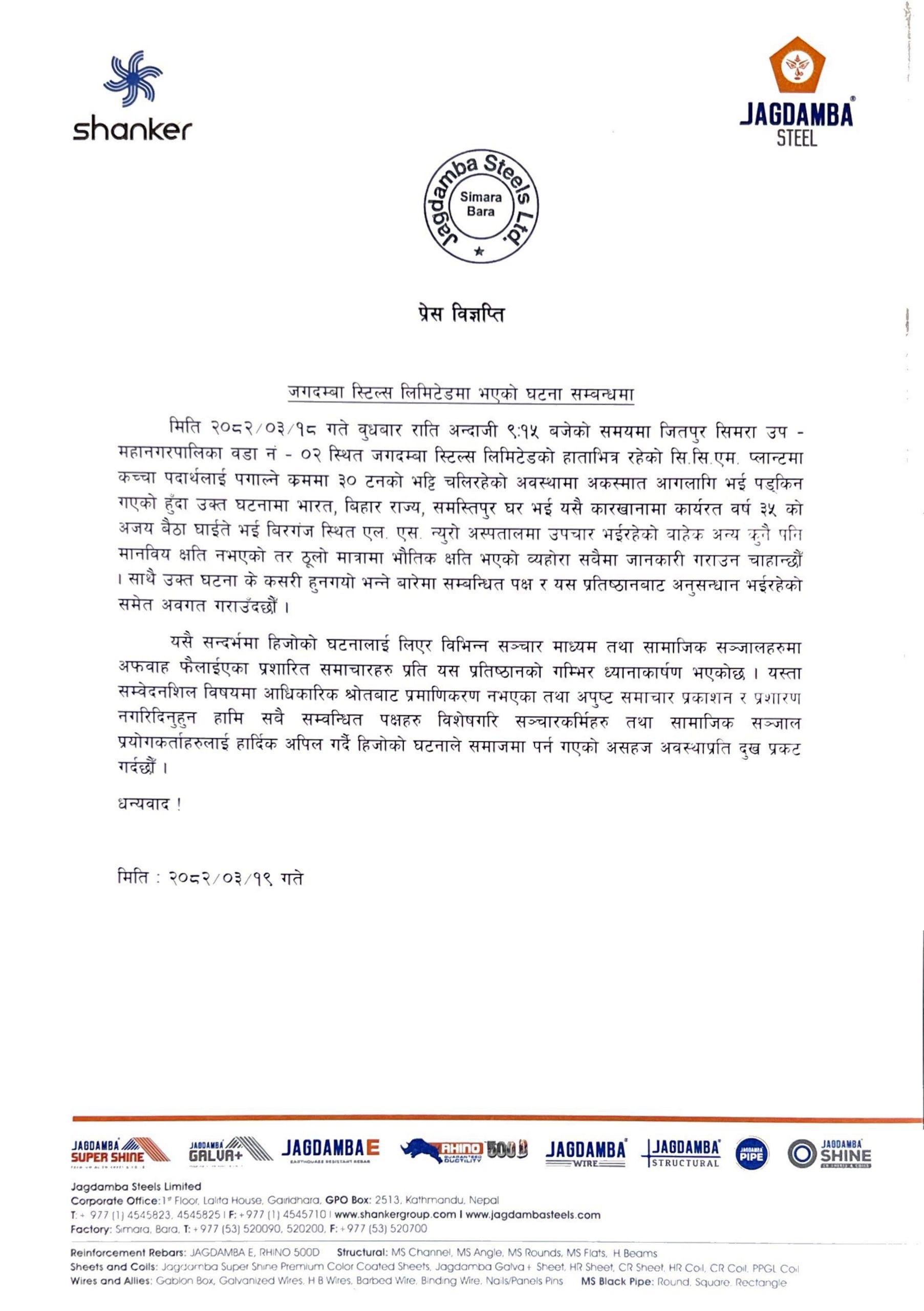 जगदम्बा स्टिल्स लिमिटेडले एक विज्ञप्ति जारी गर्दै घटनाबारे आधिकारिक पुष्टि नगरी समाचार प्रकाशन तथा प्रसारण नगर्न सञ्चारकर्मी, सञ्चार संस्था र सामाजिक सञ्जाल प्रयोगकर्ताहरूप्रति हार्दिक अपिल गरेको छ । कम्पनीले संवेदनशील विषयमा अफवाह फैलाउँदा उद्योग र स्थानीय वातावरण दुवैमा नकारात्मक असर पर्ने भन्दै चिन्ता व्यक्त गरेको छ ।