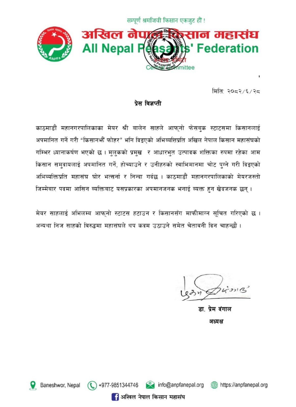 काठमाडौं महानगरपालिकाका मेयर बालेन साहले किसानलाई लक्षित गरी सामाजिक सञ्जालमा प्रयोग गरेको अभिव्यक्तिप्रति अखिल नेपाल किसान महासंघले कडा आपत्ति जनाएको छ ।