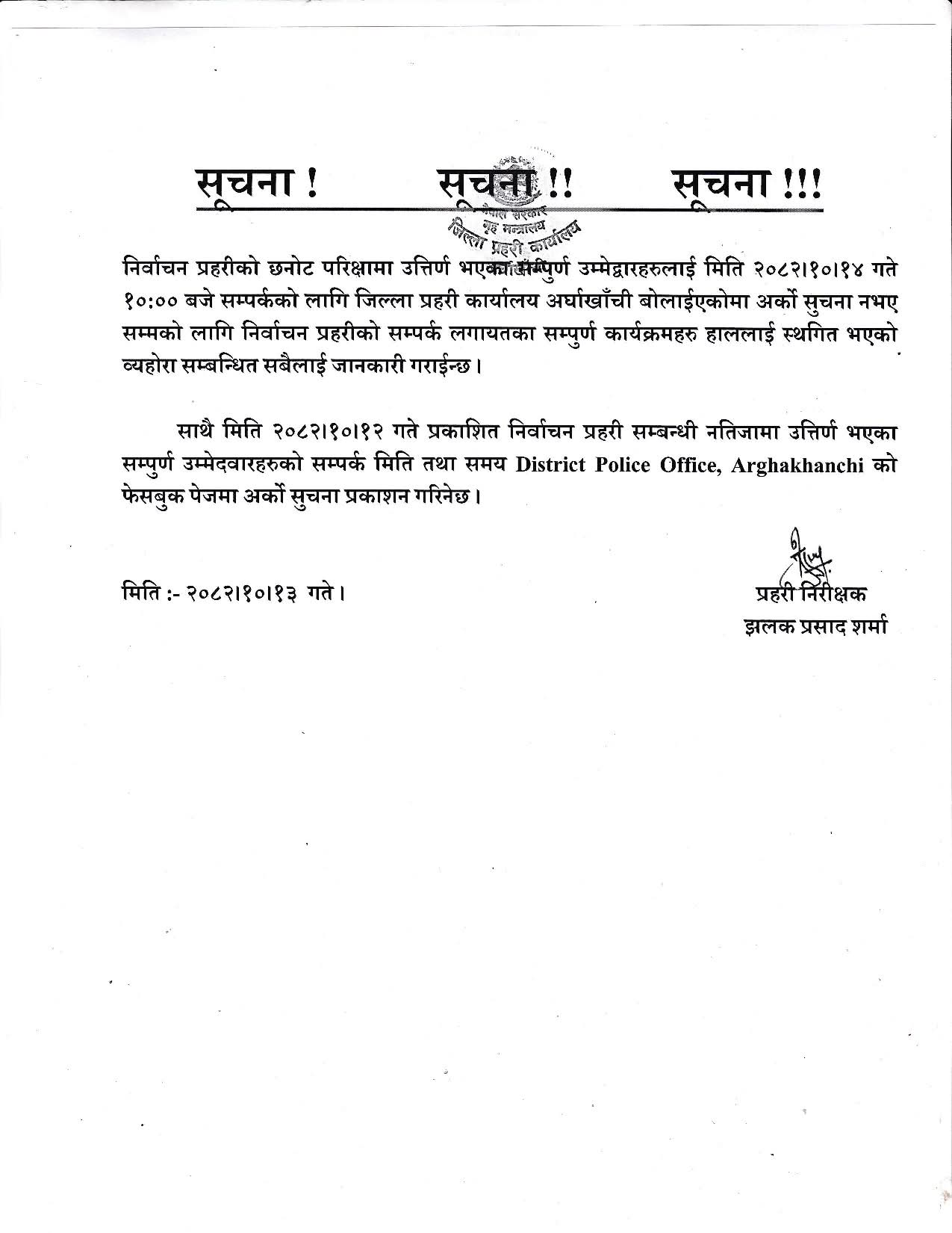 सूचनामा प्रहरी निरीक्षक झलक प्रसाद शर्माको हस्ताक्षर रहेको छ।