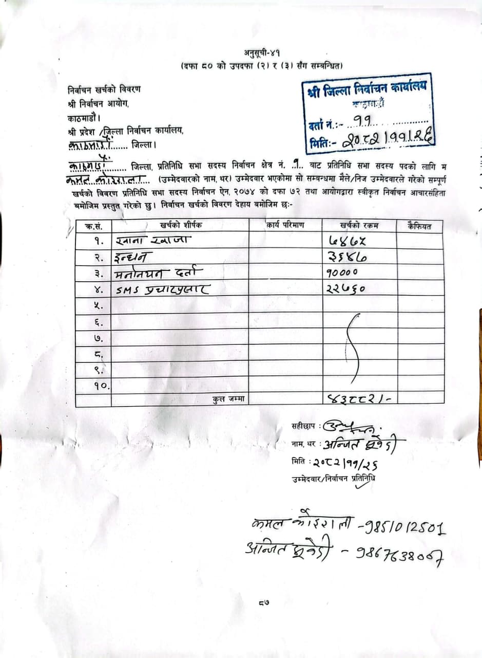यसैगरी प्रचार–प्रसारका विभिन्न कार्यक्रम तथा सामग्री व्यवस्थापनमा २२ हजार ७६० रुपैयाँ खर्च भएको विवरणमा उल्लेख गरिएको छ। यी सबै शीर्षकमा गरिएको खर्च जोड्दा कुल ४३ हजार ८८२ रुपैयाँ भएको जनाइएको छ।